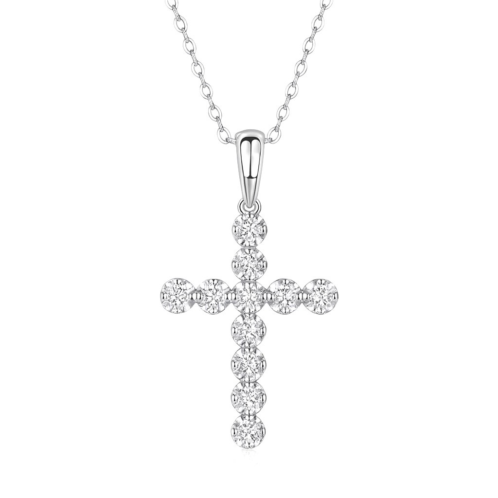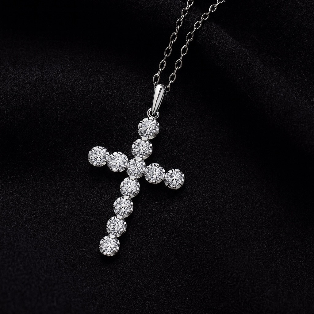A timeless cross design adorned with brilliant D color VVS1 moissanite stones, offering exceptional sparkle and elegance.